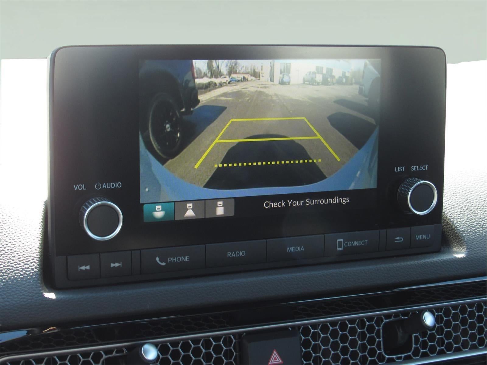 - The vehicle is equipped with a camera that displays an image of the area behind the vehicle on an interior display.